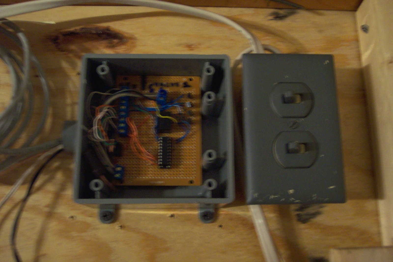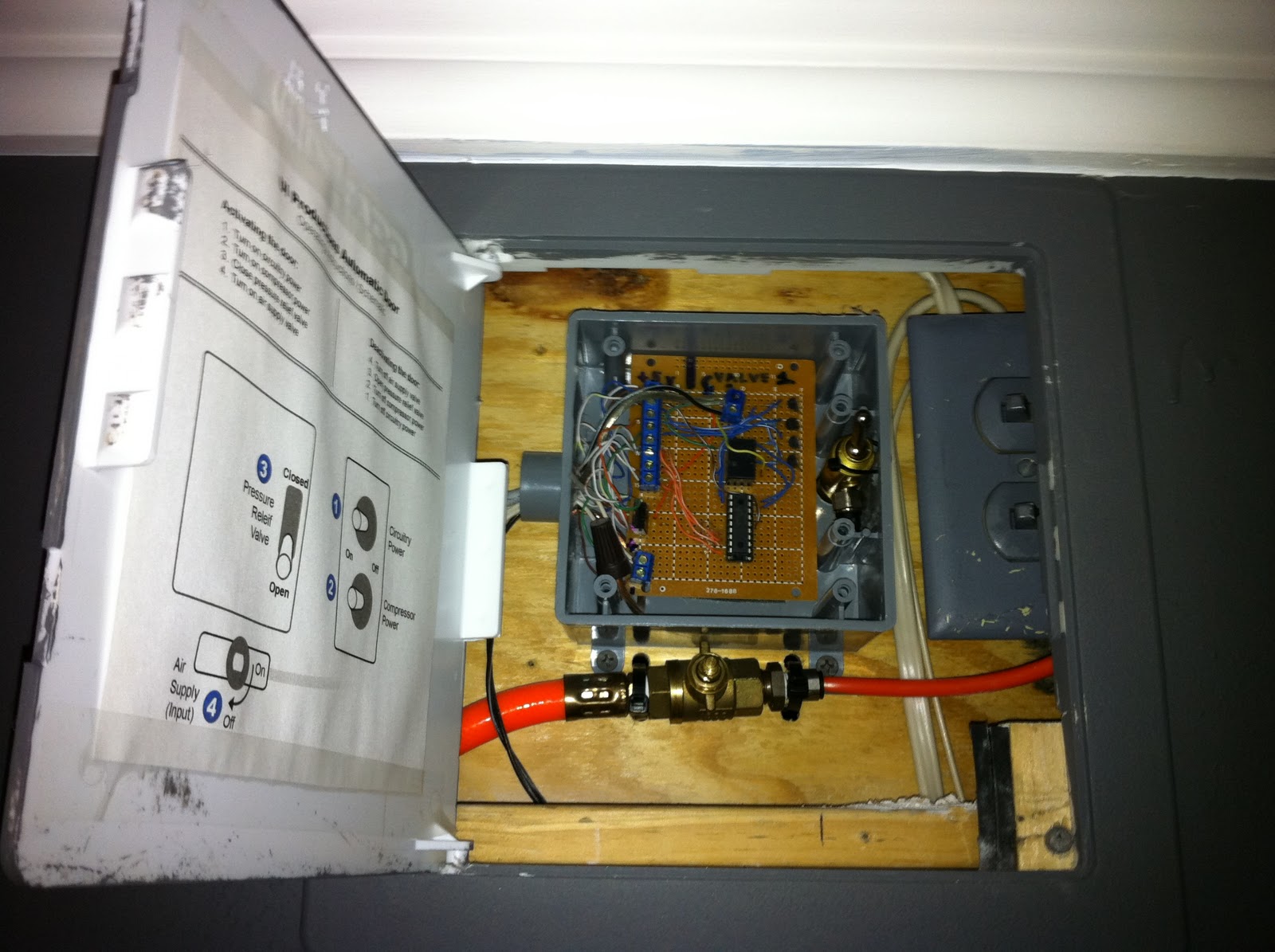 With the mechanical side of the project functional now, it was time to work on the electrical a bit. I mounted a DIP socket, a relay, and a few other components on a Radio Shack perf board, and placed the whole thing inside a plastic junction box. I added two power switches, one supplying AC power to the wall adapter for the circuitry, and the other supplying power to the compressor in the attic. I wanted the whole system to be enabled and disabled from this "control panel", including the air supply.