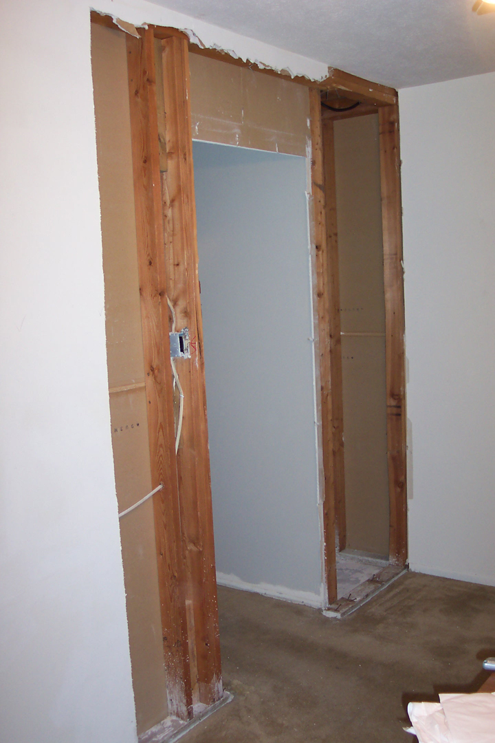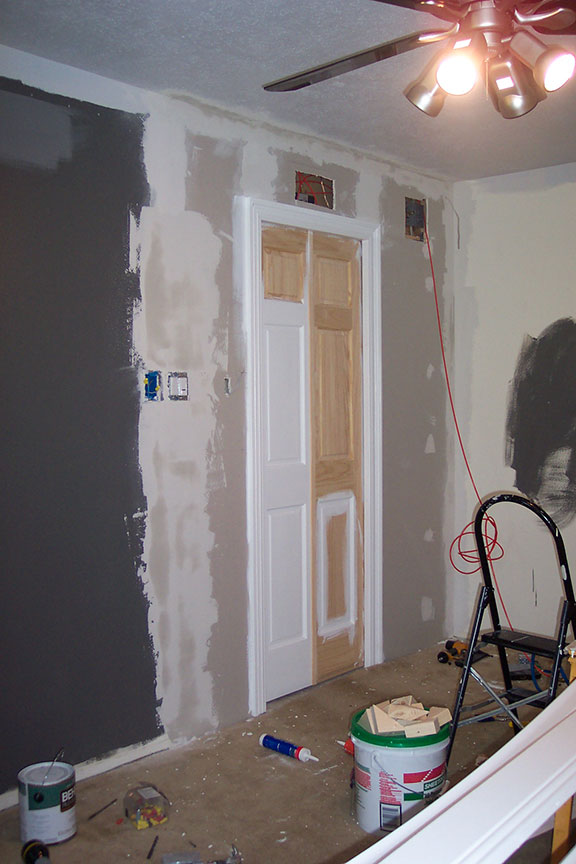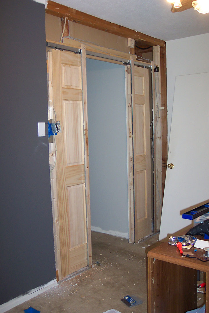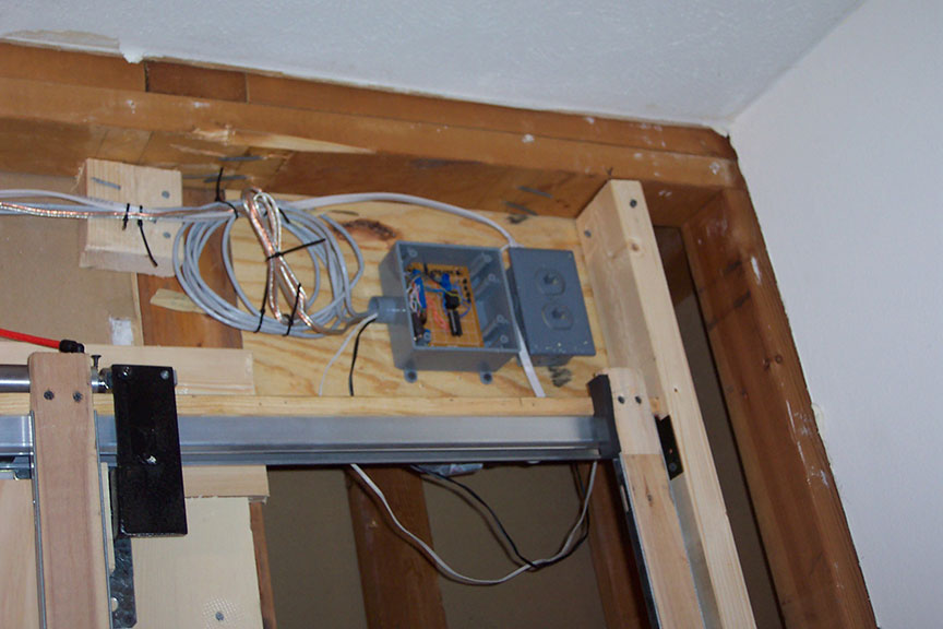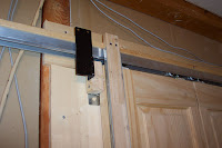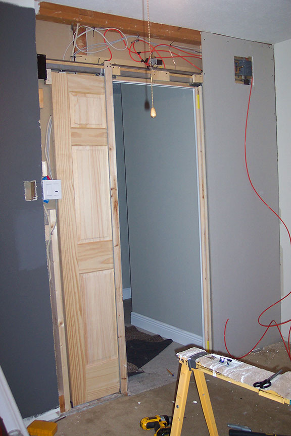 After countless cycles of testing and tweaking the door operation with the wall open for a month or two, I finally felt comfortable closing up the wall. Here you can see some of the new drywall starting to go back up.