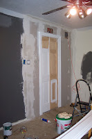 By this point, the hallway outside my room was a mess, with cracked drywall from my not-so-elegant crowbar and sledgehammer stud removal process. Carpet was about to go down in the hallway, so it was time to patch things up on the outside.