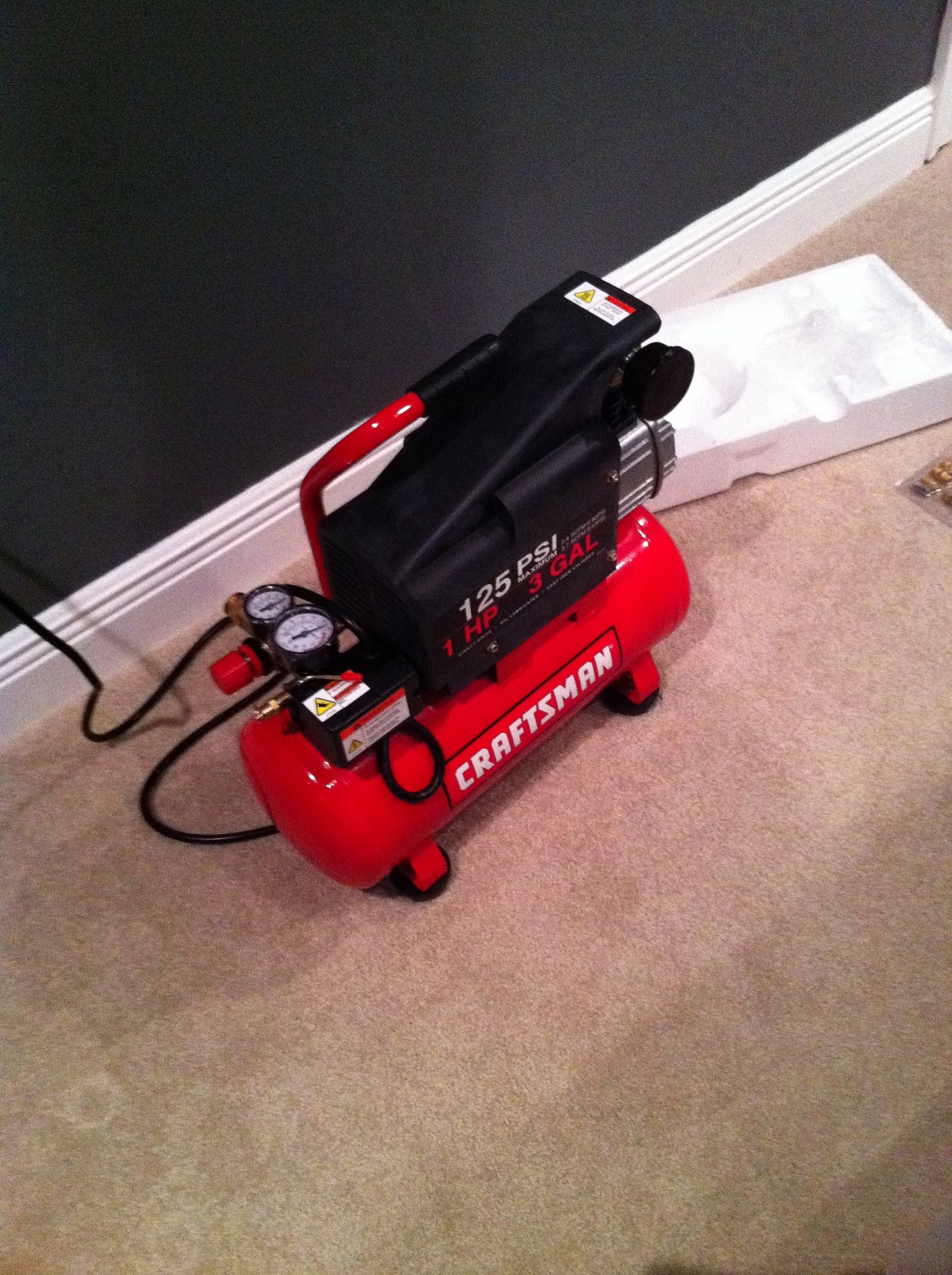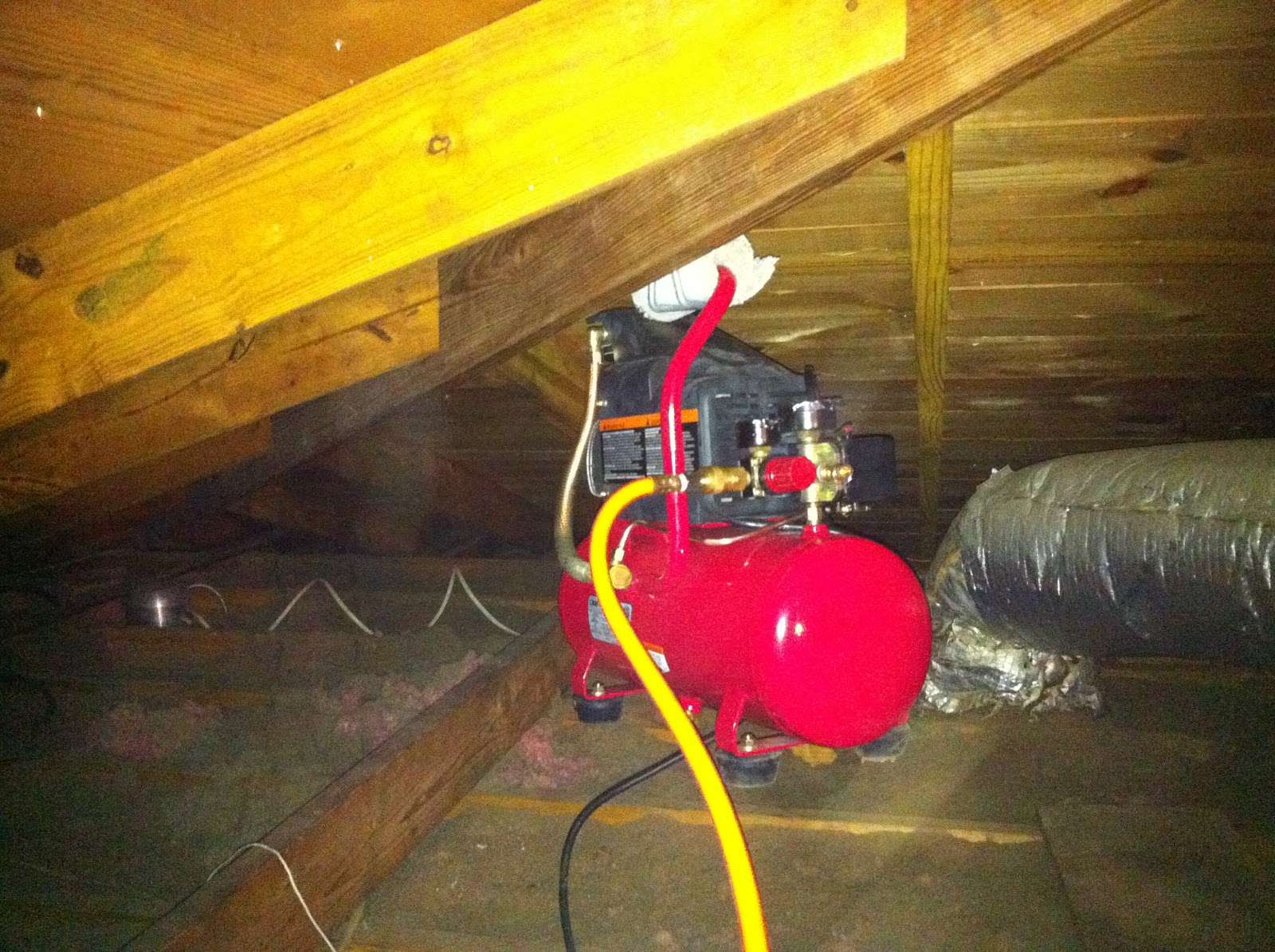 And that just about wraps it up. Four years later, the door is still up and running, and I recently took some photos and video of it in action during my last trip back home. I also decided to upgrade the air compressor to a new Craftsman 1HP model with a much higher SCFM for faster refilling. The compressor is hung from a roof beam in the attic with padding to dampen any vibrations.