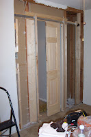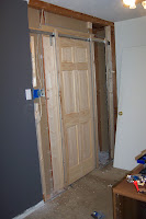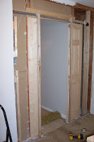 With all of the interfering studs removed from the wall, I held the rear drywall in place with 3/4" thick wood boards, which would still leave room for the door to travel through the wall. I added a new 2x4 stud on one side to support the pocket door track, and installed the track and a door half using the included hardware. You can see below how the one half will slide into the wall cavity.
