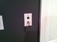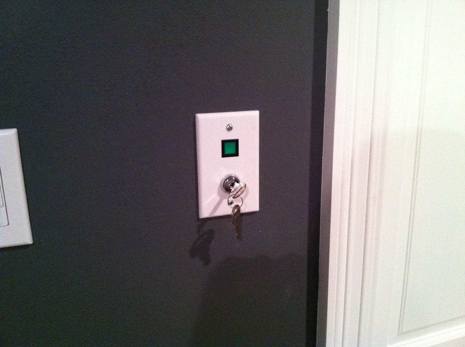 From there it was just a matter of painting the wall, and it was back to looking stock. I purchased a blank white wall plate from Home Depot. I drilled it out for an illuminated pushbutton and a 3-position keyswitch, both of which I bought from McMaster. I also purchased a plastic hatch door from McMaster for the control box. Lastly, I added an air conditioning vent above the door. This lets the air venting noises be heard, and it also provides me access to the valve and pistons should anything go wrong.